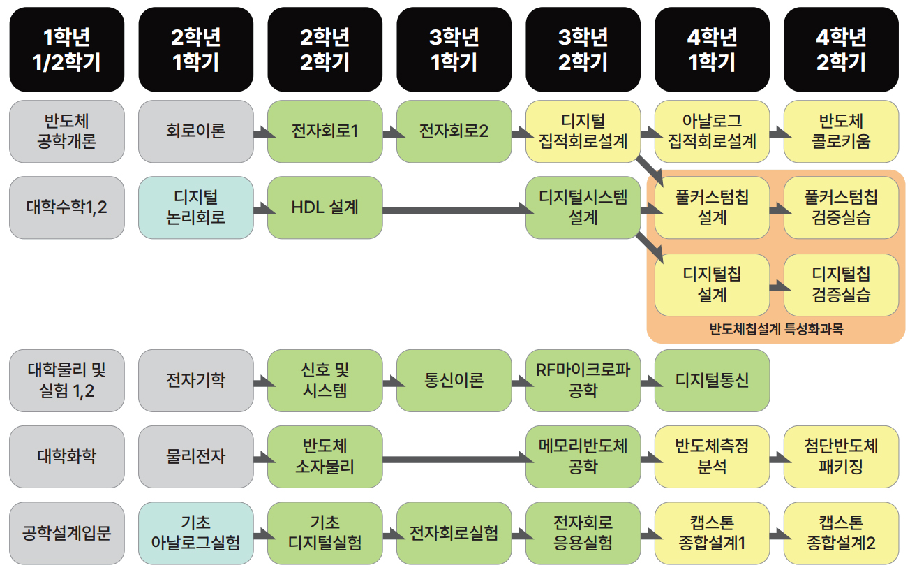 | 필수 교과목 | ① 기초아날로그실험, 기초디지털실험, 전자회로실험, 전자회로응용실험, 캡스톤종합설계1/2 ② 풀커스텀칩설계 또는 디지털칩설계 중 1과목 이수 ③ 풀커스텀칩검증 또는 디지털칩검증 중 1과목 이수 |