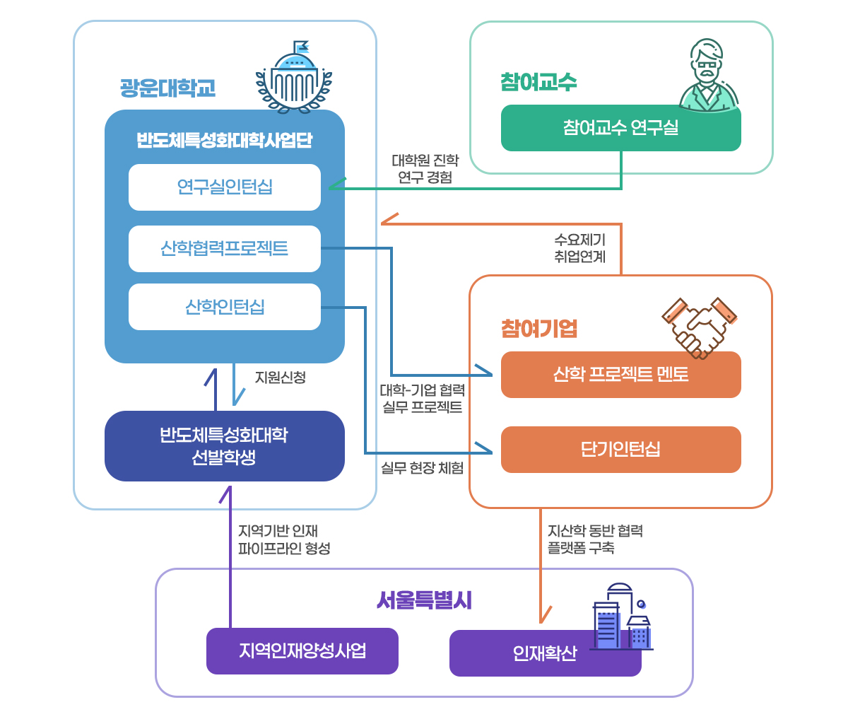 광운대학교 내의 주전공/연계전공/전공트랙 교육과정과, 지역/산업계/학계 협력을 통한 비교과 교육과정(지산학 협력프로그램)을 함께 운영하여 학문적인 역량과 실무적인 역량을 동시에 갖출 수 있도록 합니다.
